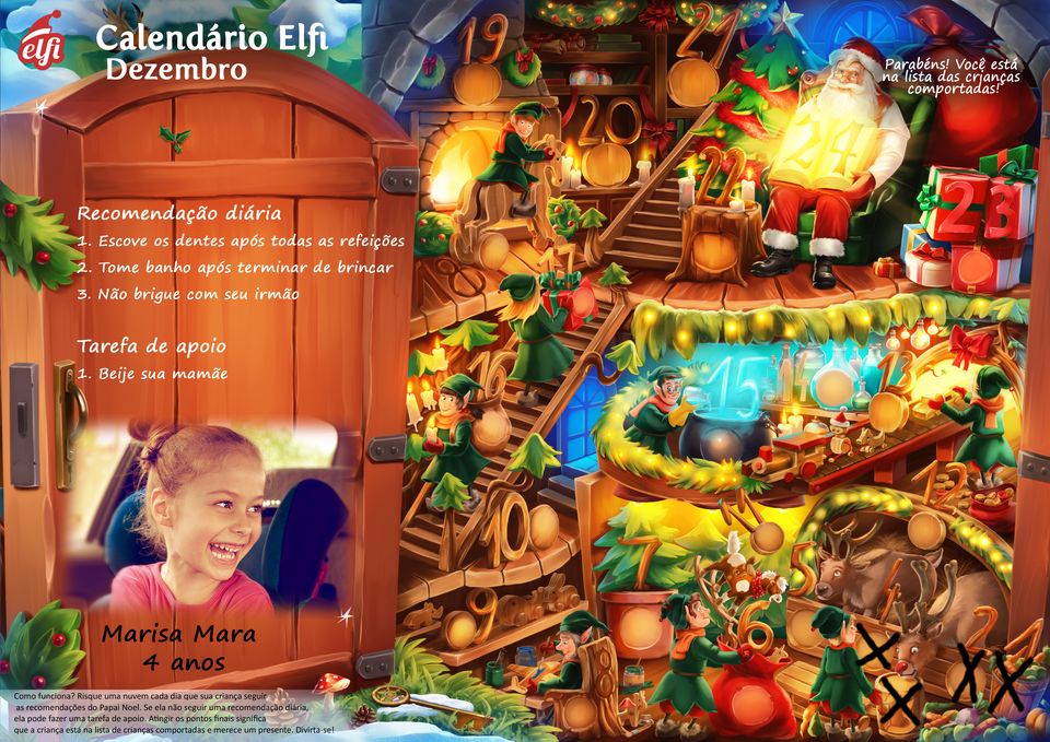 Um calendário do advento personalizado tornará a contagem regressiva para o Natal ainda mais especial. O que diferencia o calendário do Elfi? Ele contém uma foto com o nome da criança e felicitações por ocupar um lugar na lista de crianças bem comportadas. É claro que isso não é tudo! O calendário contém uma lista de tarefas importantes do próprio Papai Noel. Esta lista pode incluir recomendações como: lavar os dentes, dar um abraço na mãe, organizar os brinquedos, etc. As recomendações fazem o calendário cumprir também um papel educativo.